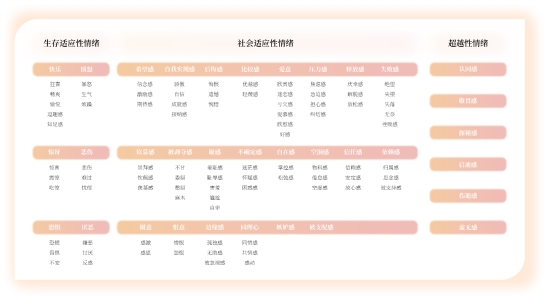 为帮助美护品牌精准捕捉这些行动线索,小红书联合睿从构建了「情绪研究方法论」,从心理学底层架构出发,结合生存适应性、社会适应性、超越性三大情绪来源,搭建出一个包含3层来源、35个大类、95个具体情绪的结构化框架,让“情绪”在美尚行业首次被系统性地定义。